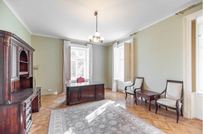 Citlivě zrekonstruovaná vila k pronájmu s důrazem na zachování původních architektonických prvků je obklopena pečlivě udržovanou zahradou s tenisovým kurtem, kašnou a altánkem. Vstupní patro nabízí halu s původním schodištěm, rozlehlý obývací pokoj se vstupem do prostorné pracovny, reprezentativní jídelny s plně vybaveným kuchyňským koutem a vstupem do zimní zahrady. Zbylá podlaží disponují celkem 7 ložnicemi, 5 koupelnami a dalšími 2 kuchyněmi.