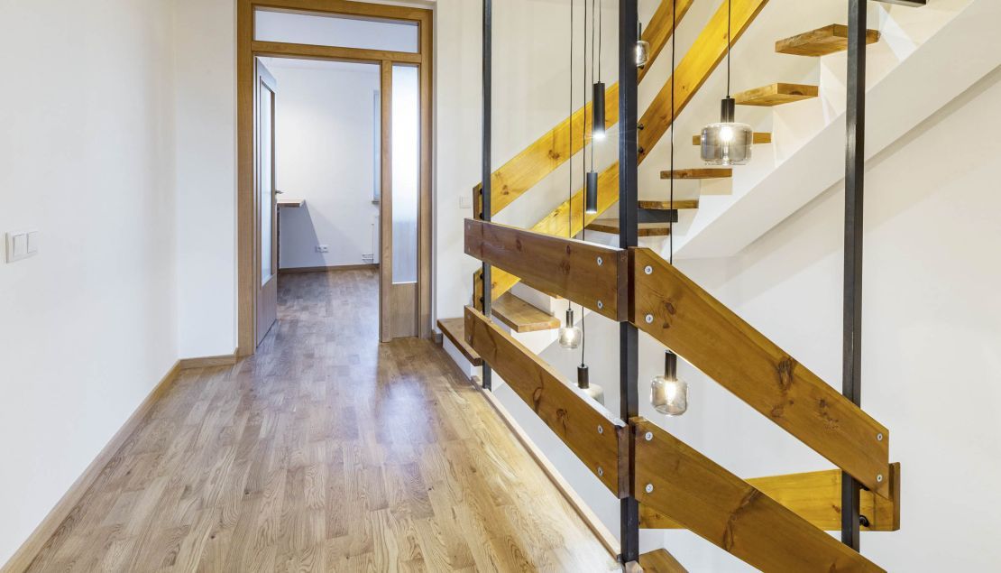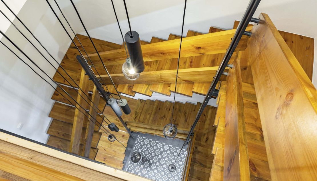 Interiér tvoří v přízemí vstupní chodba také se zadním vchodem na zahradu s bazénem, koupelna (sprchový kout) a sauna. V patře pak naleznete obývací pokoj s balkónem, kuchyň s přímým vstupem na terasu s výhledem na zahradu, koupelnu (vana a toaleta) a samostatnou toaletu. V dalším patře pak 2 ložnice a koupelnu (sprchový kout a toaleta). Suterén nabízí herní prostor pro děti nebo fitness. K domu náleží garáž a venkovní stání přímo před domem na pozemku.