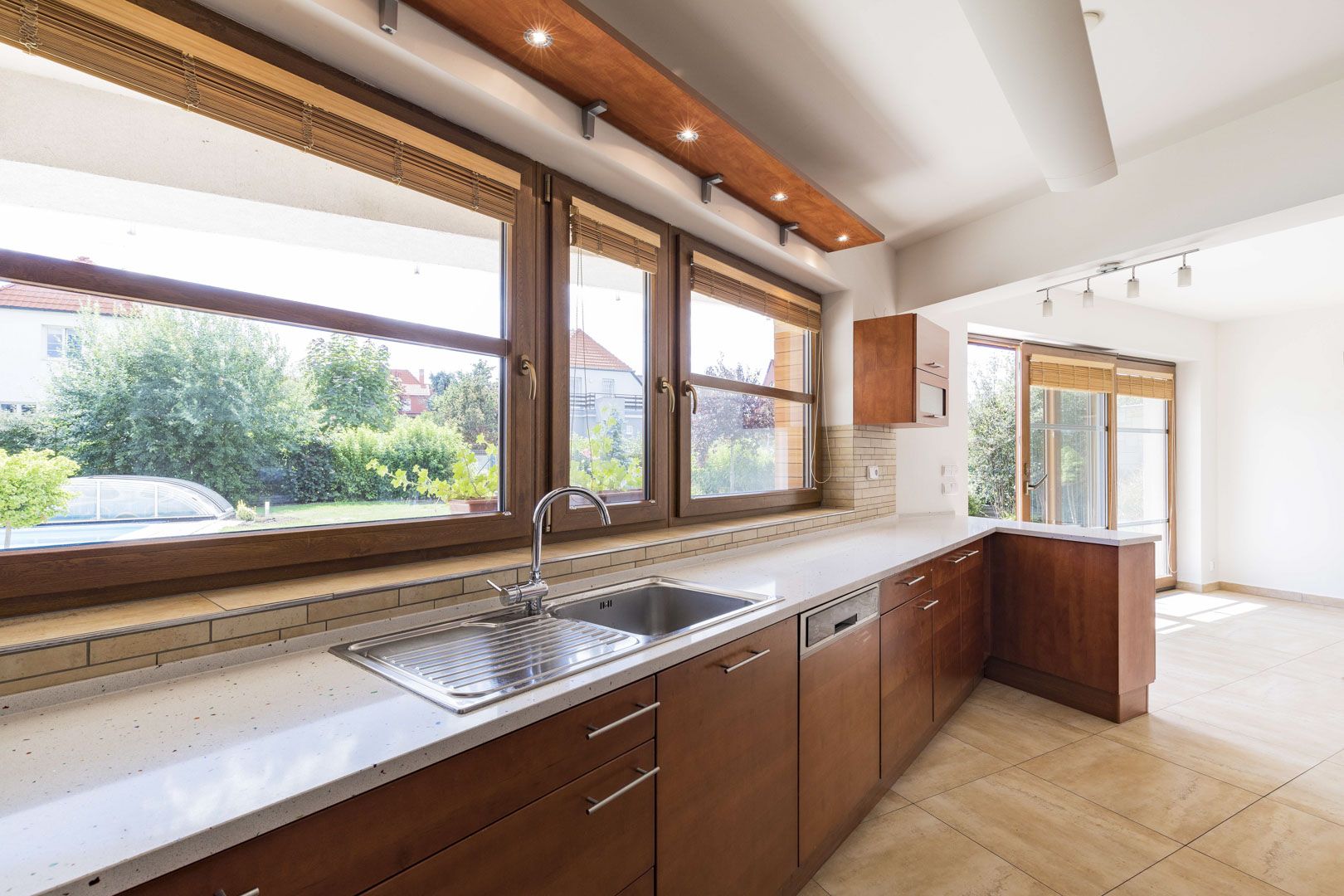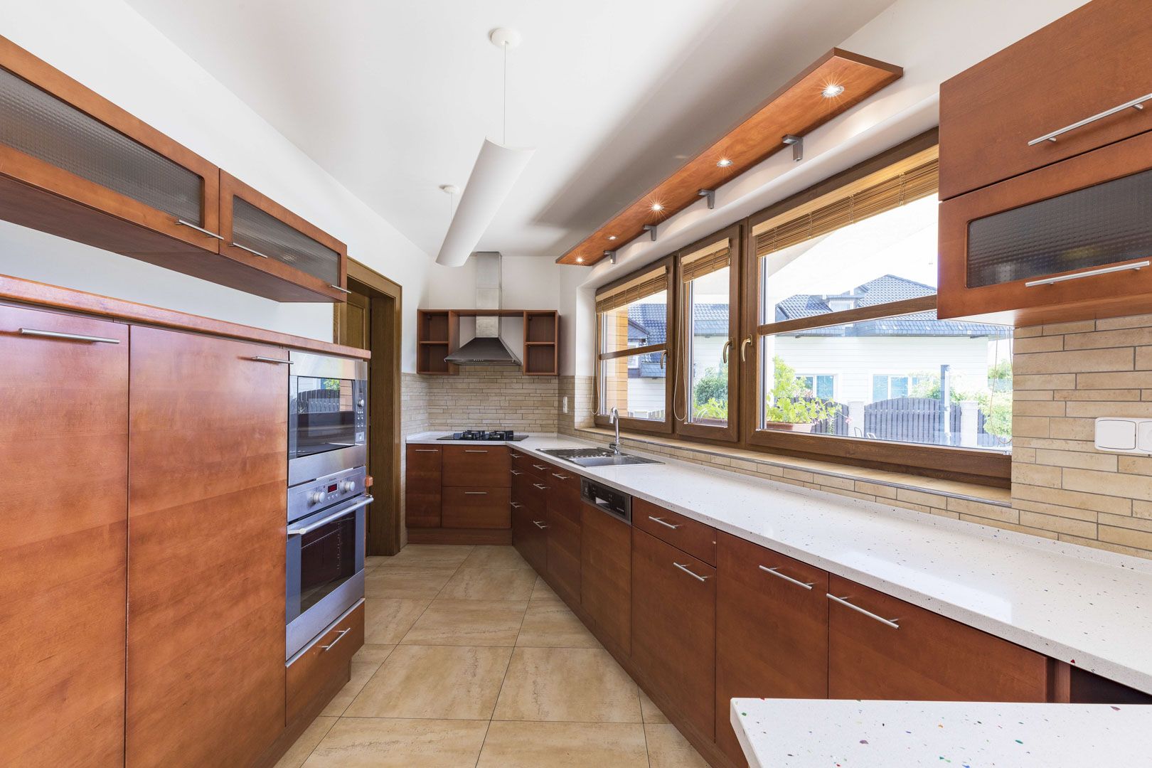Samostatná kuchyň disponuje sklokeramickou deskou, troubou, lednicí, mrazákem, mikrovlnnou troubou a myčkou na nádobí.