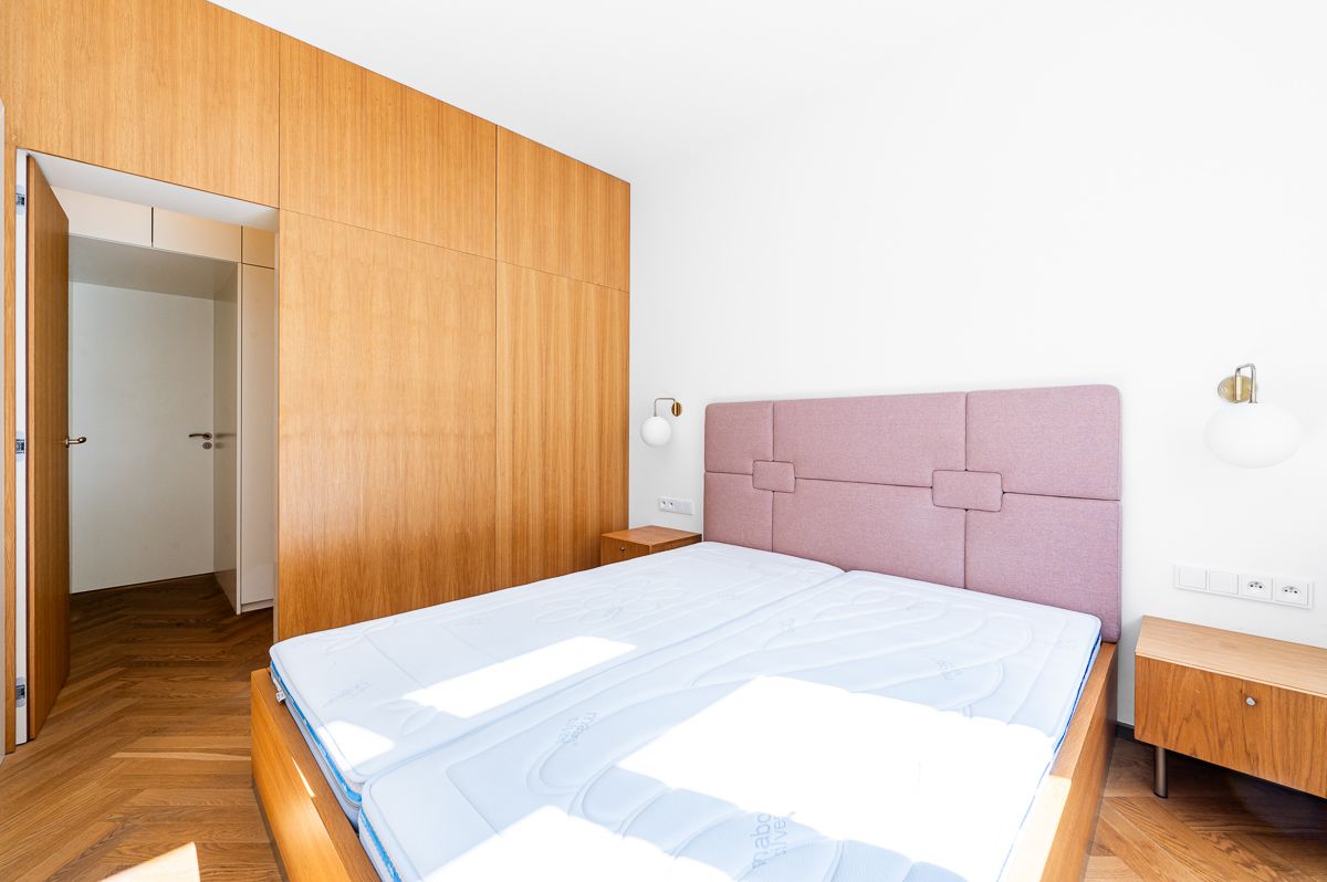 Světlý a nadstandardně zařízený interiér nabízí prakticky řešenou vstupní chodbu s vestavěnou skříní, prostorný obývací pokoj s jídelní částí a plně vybavenou kuchyní (sklokeramická indukční varná deska, trouba s mikrovlnnou troubou a párou, lednice s mrazákem, myčka nádobí). Dispozice zahrnuje dvě ložnice situované na opačných koncích bytu. Rodičovská ložnice nabízí vyšší míru soukromí díky vlastní šatně a koupelně se sprchovým koutem a toaletou. Hlavní koupelna je vybavena vanou, toaletou, pračkou, sušičkou a podlahovým topením. Garážové stání mimo budovu možno domluvit za poplatek 4 500 Kč/měsíc. Stejně tak 10 m2 sklepní kóji v budově za 1 500 Kč/měsíc.
