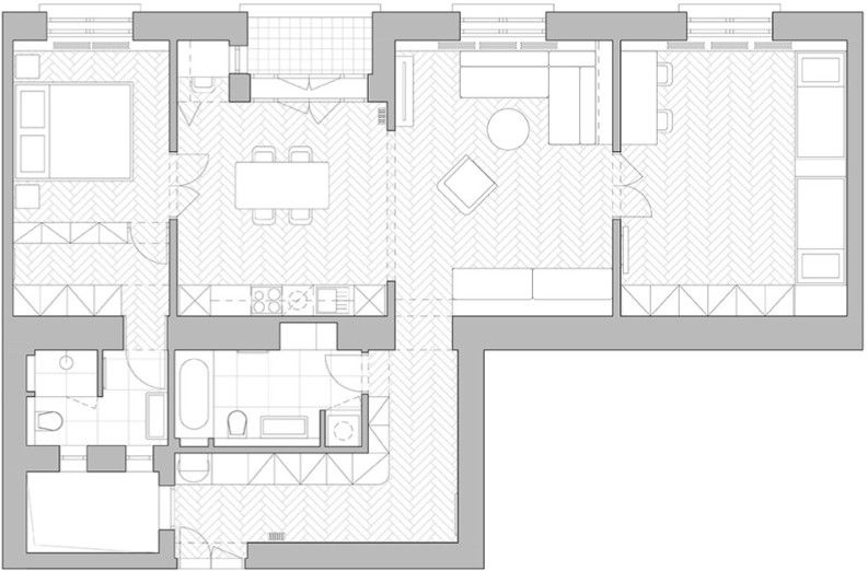 Architekti citlivě promítli dobové detaily budovy do interiéru - kapotáže topných těles navazují na motivy historického domovního zábradlí, špičaté obložky dveří odkazují na štukovou výzdobu oken a polstrované prvky citují vzor z původních vstupních dveří. V hladkých plochách interiéru se zdůrazňuje ušlechtilost použitých materiálů: dubových dýh a jemně tónovaných lakovaných povrchů.